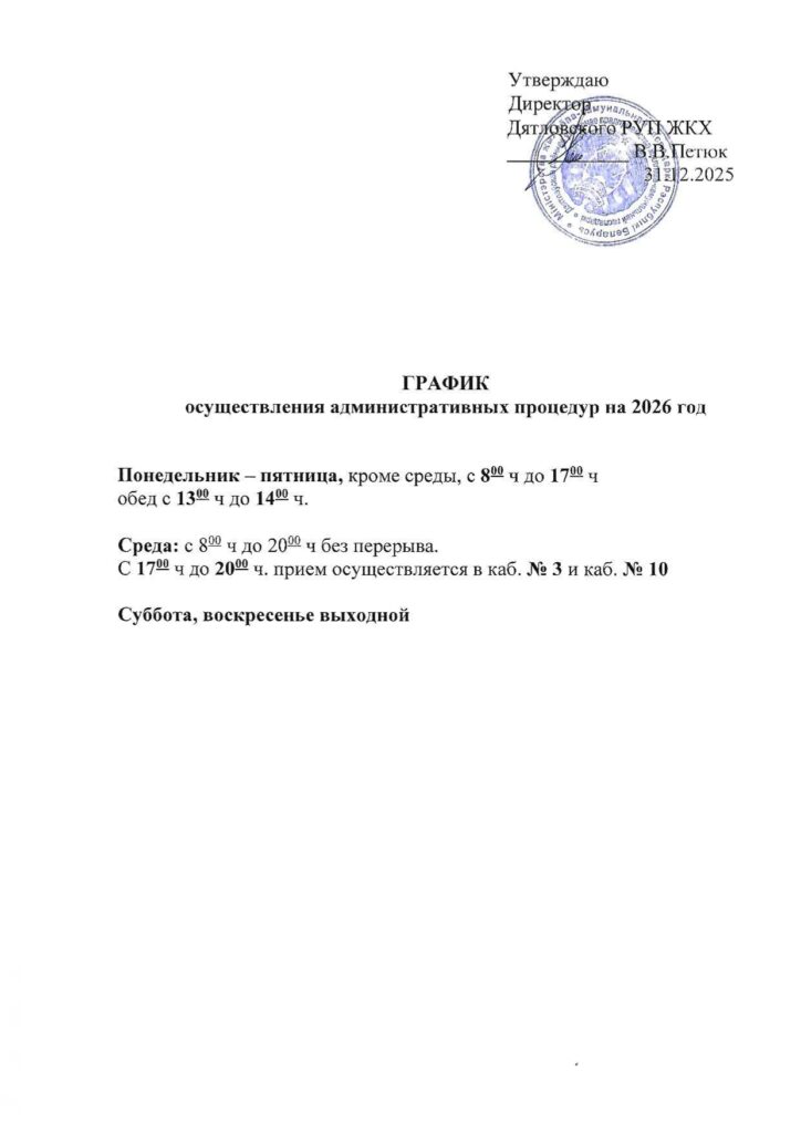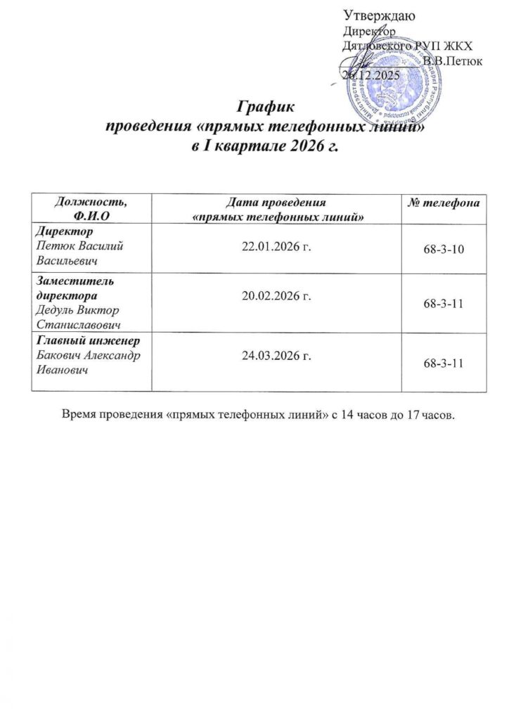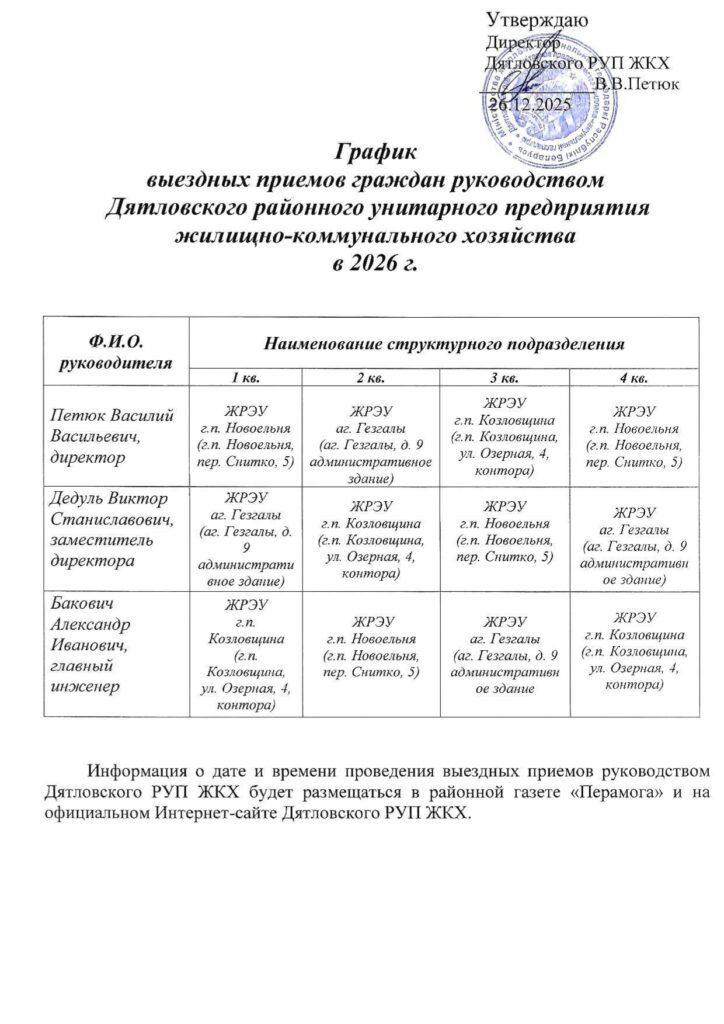 График личного приема граждан, их представителей, представителей юридических лиц руководством Дятловского РУП ЖКХ
